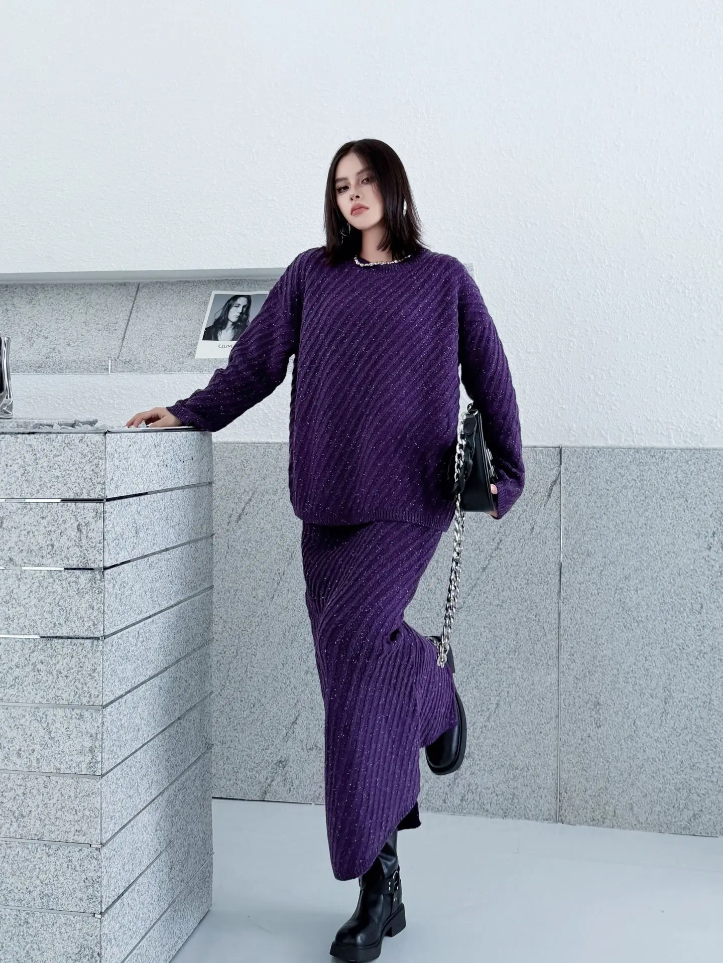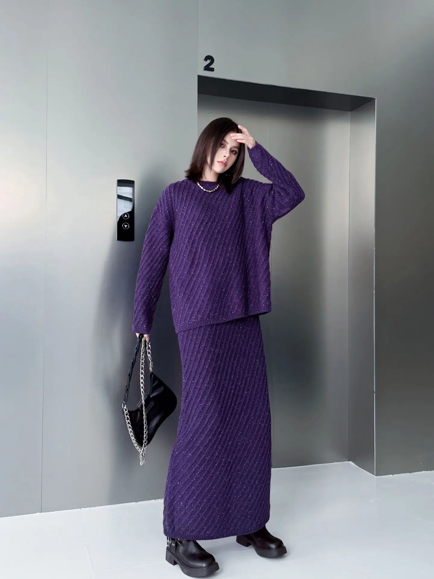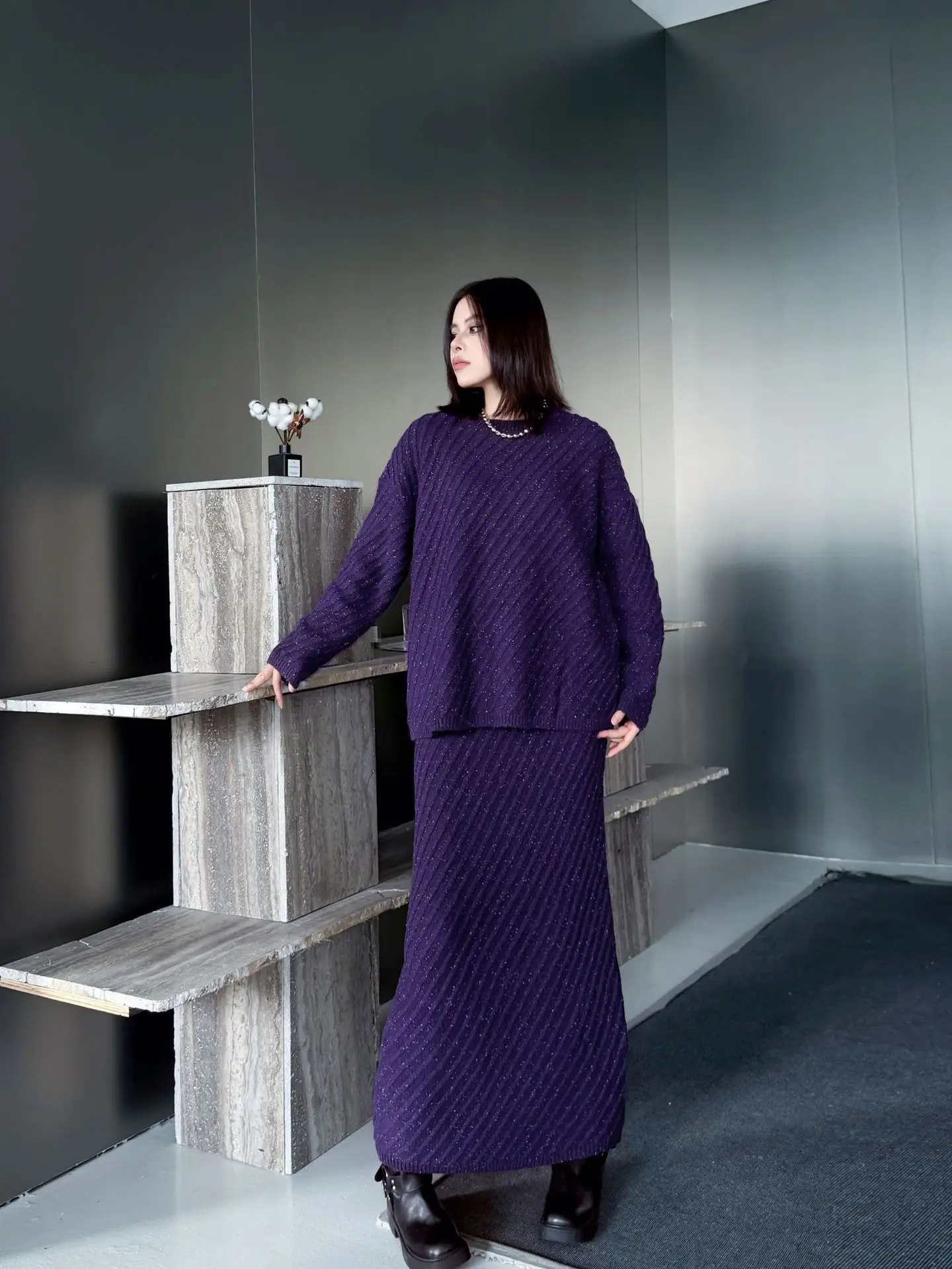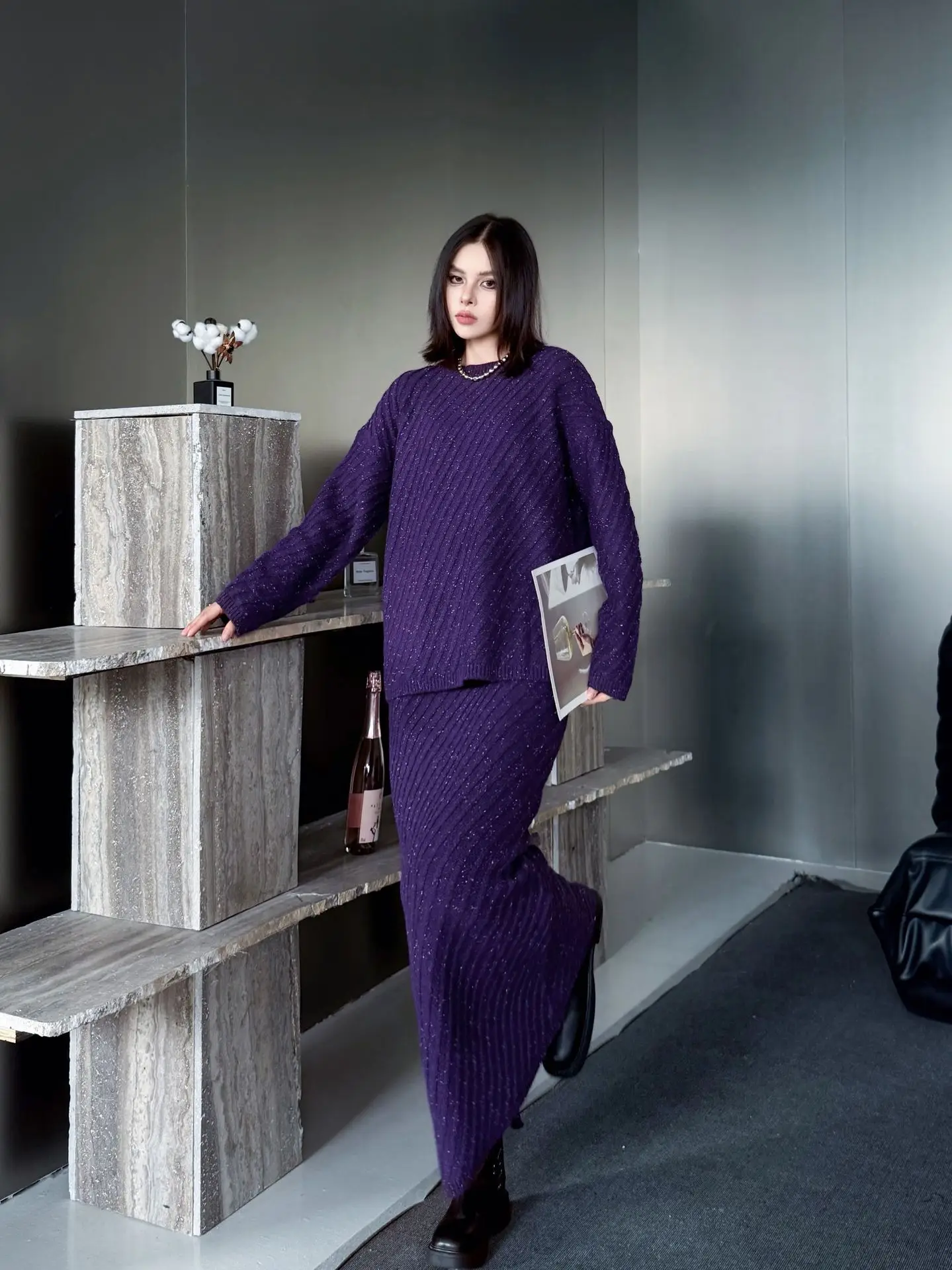 2 Piece Cotton Blend Oversized Pullover Sweater+MAXI Skirt Set
