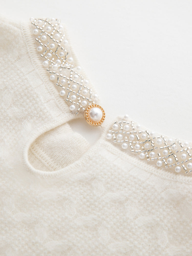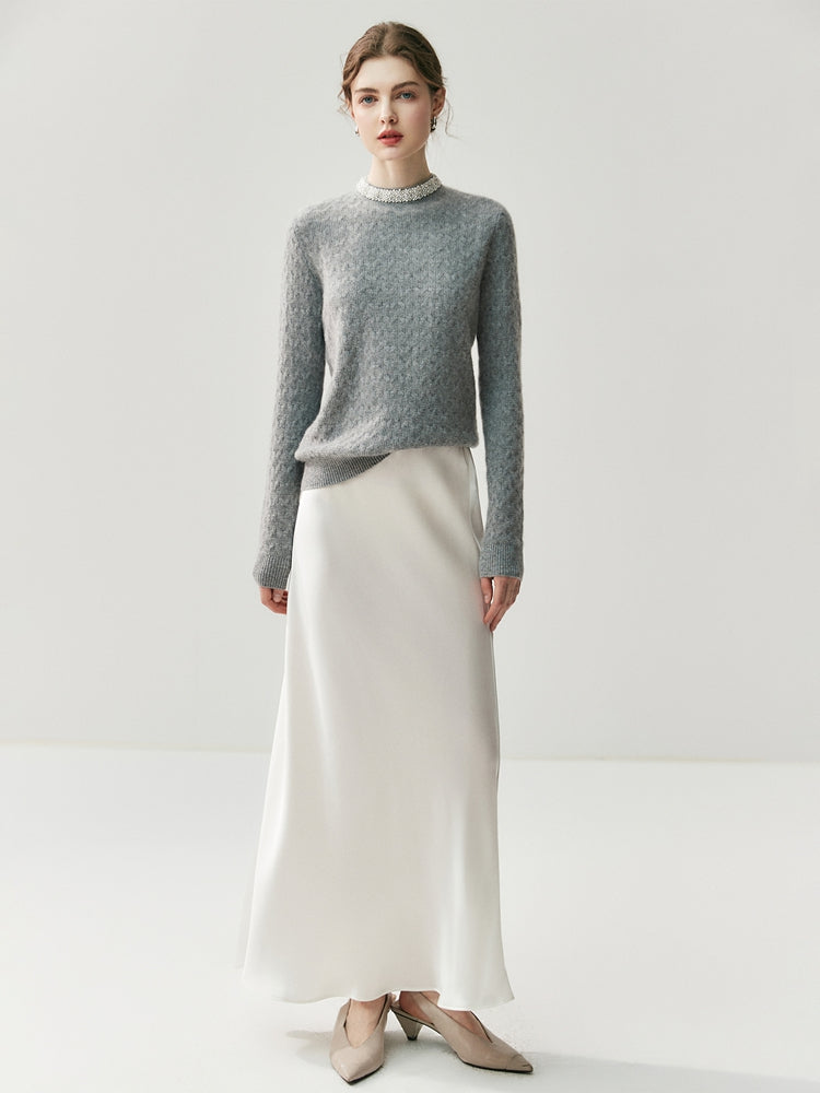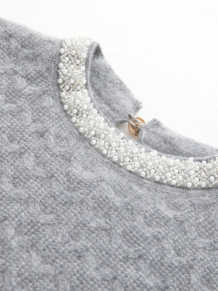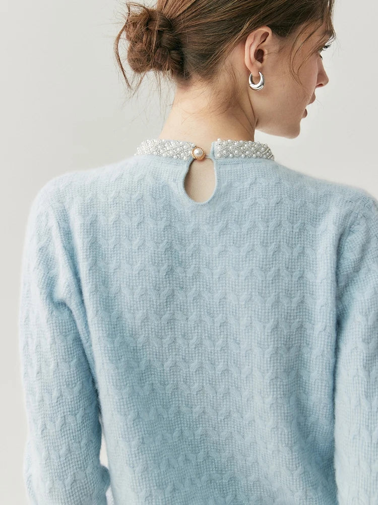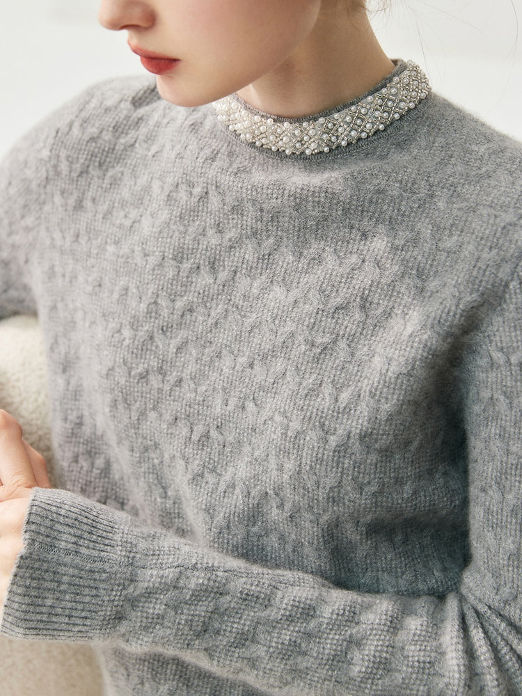Classic French Minimalist 100% Cashmere Beaded Cable Knit Sweater