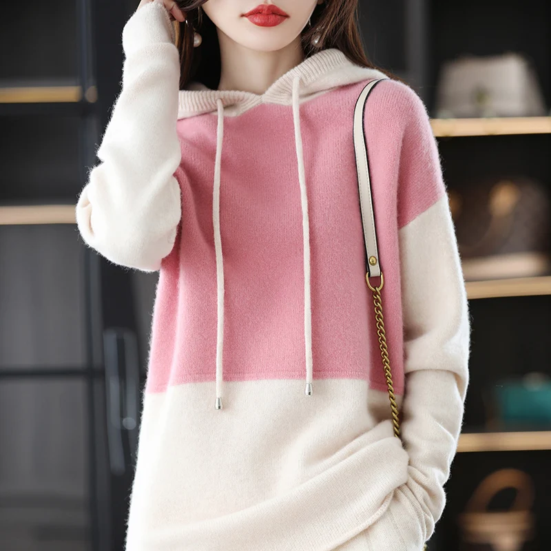 Person wearing a pink and white two-tone hoodie with a blurred background