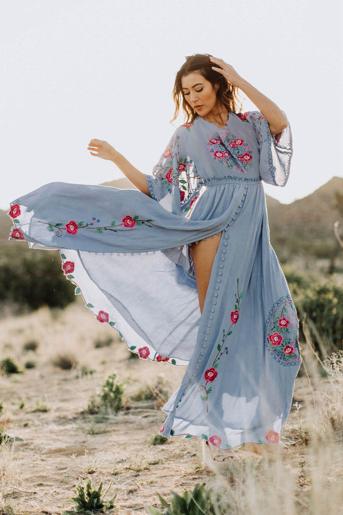Crafted from lightweight and breathable fabric, this dress offers unmatched comfort while showcasing timeless boho vibes. The soft, sky-blue backdrop serves as a perfect canvas for the vivid embroidery, evoking dreamy desert sunsets and carefree wanderlust.