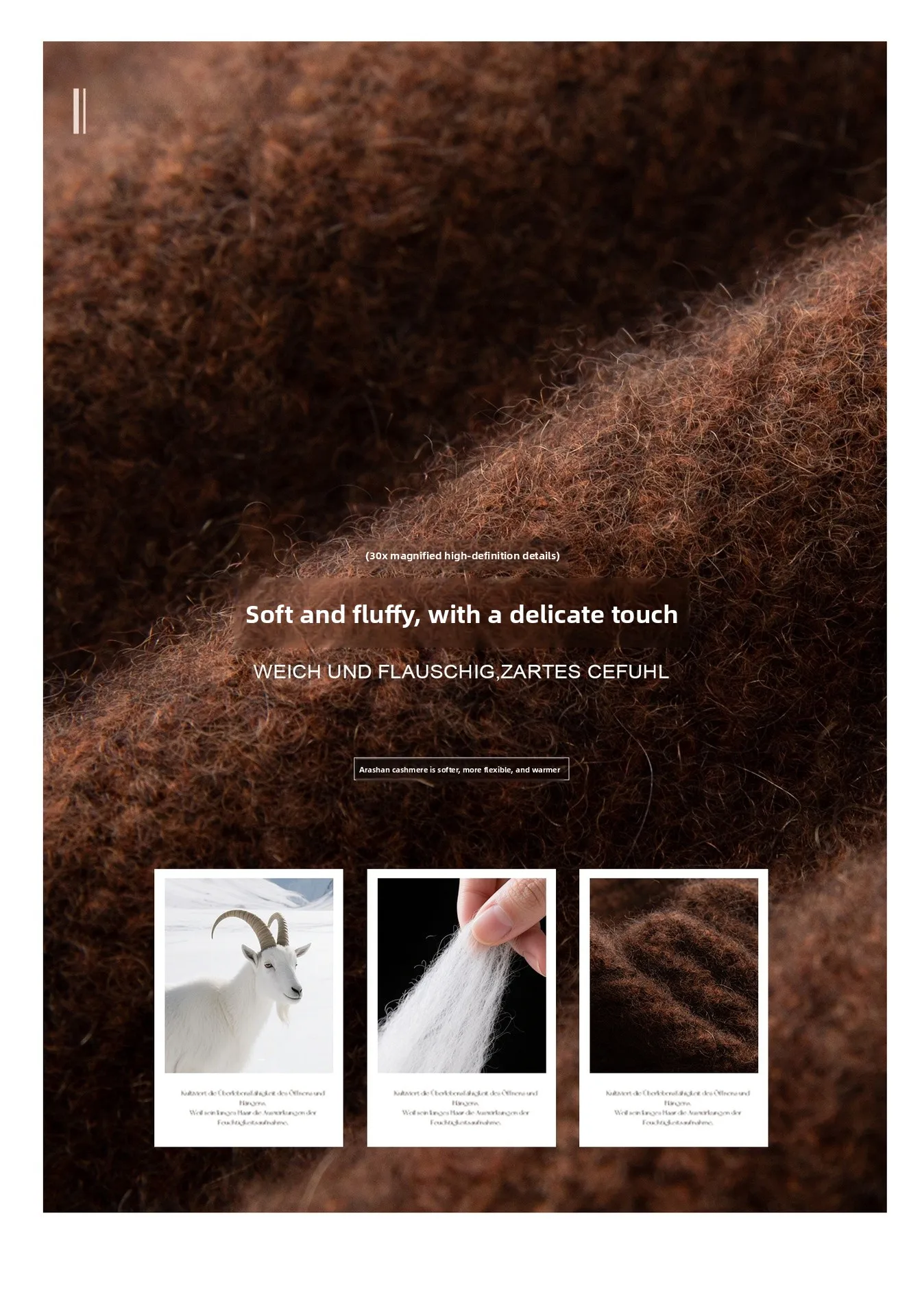 The fiber diameter of cashmere is smaller than wool, the texture is more delicate and soft, and the scale structure of cashmere is smaller, making its thermal performance better than wool. Wool fibers are relatively thick, hard in texture, and not as warm as cashmere.