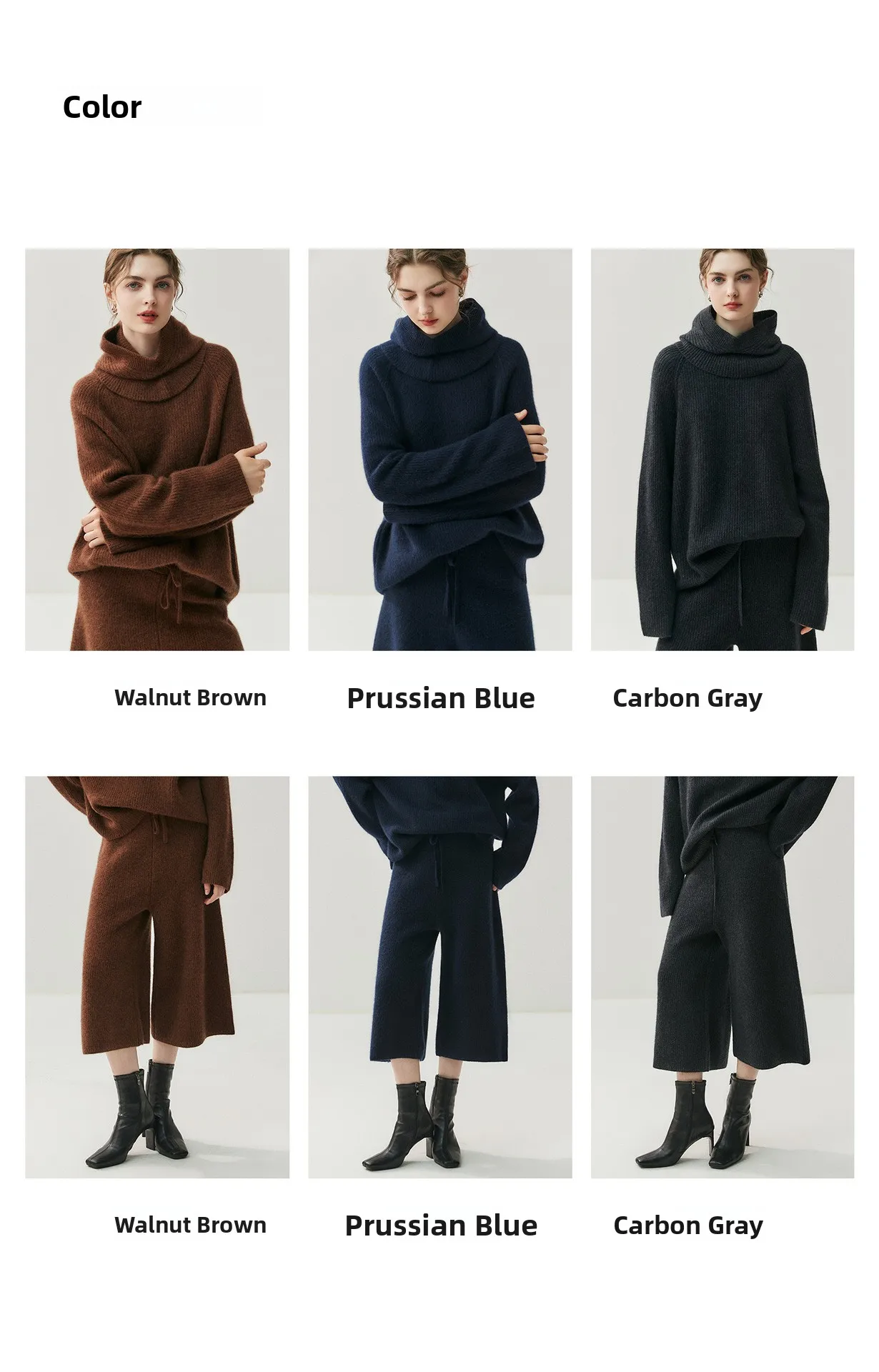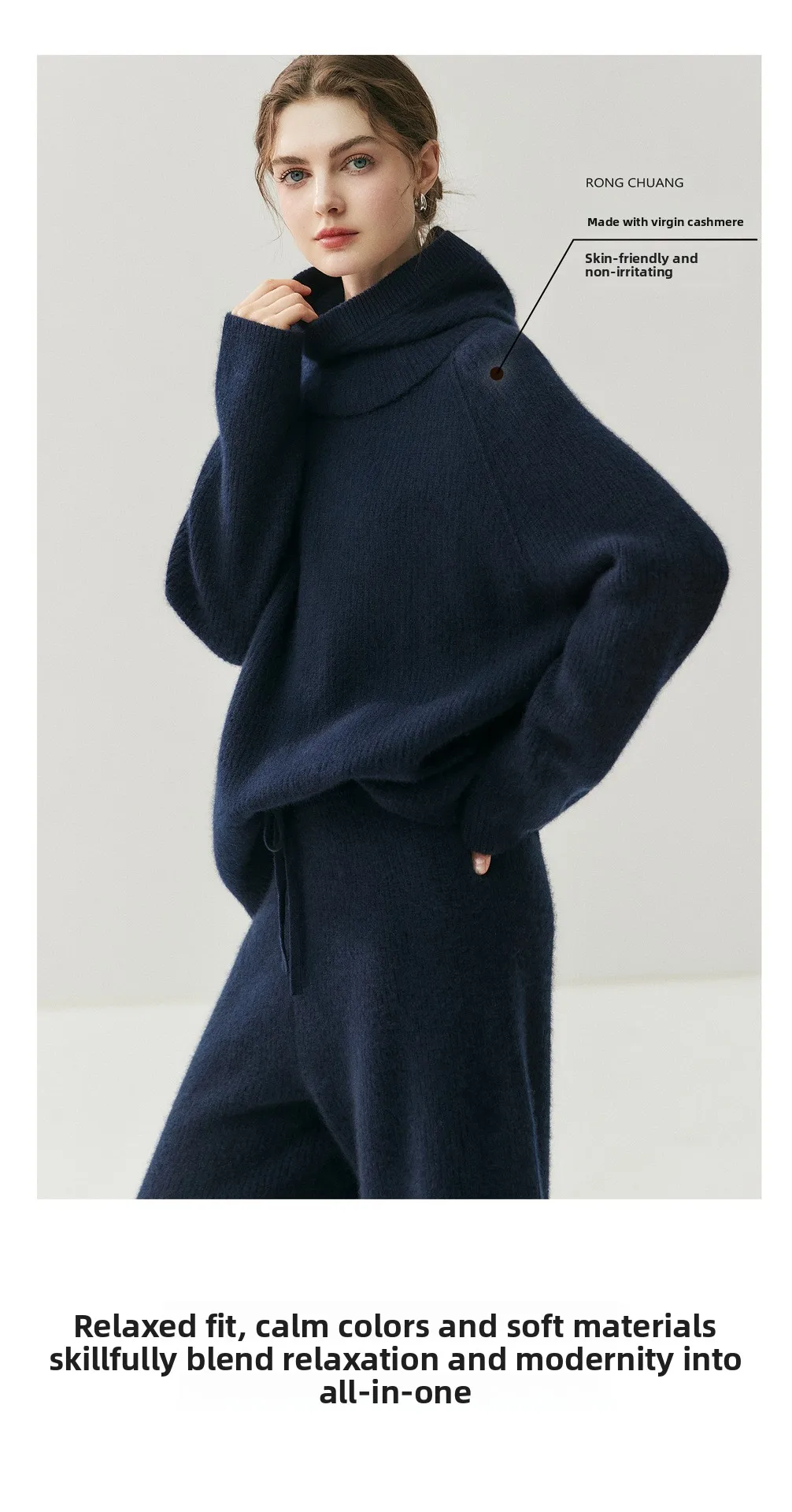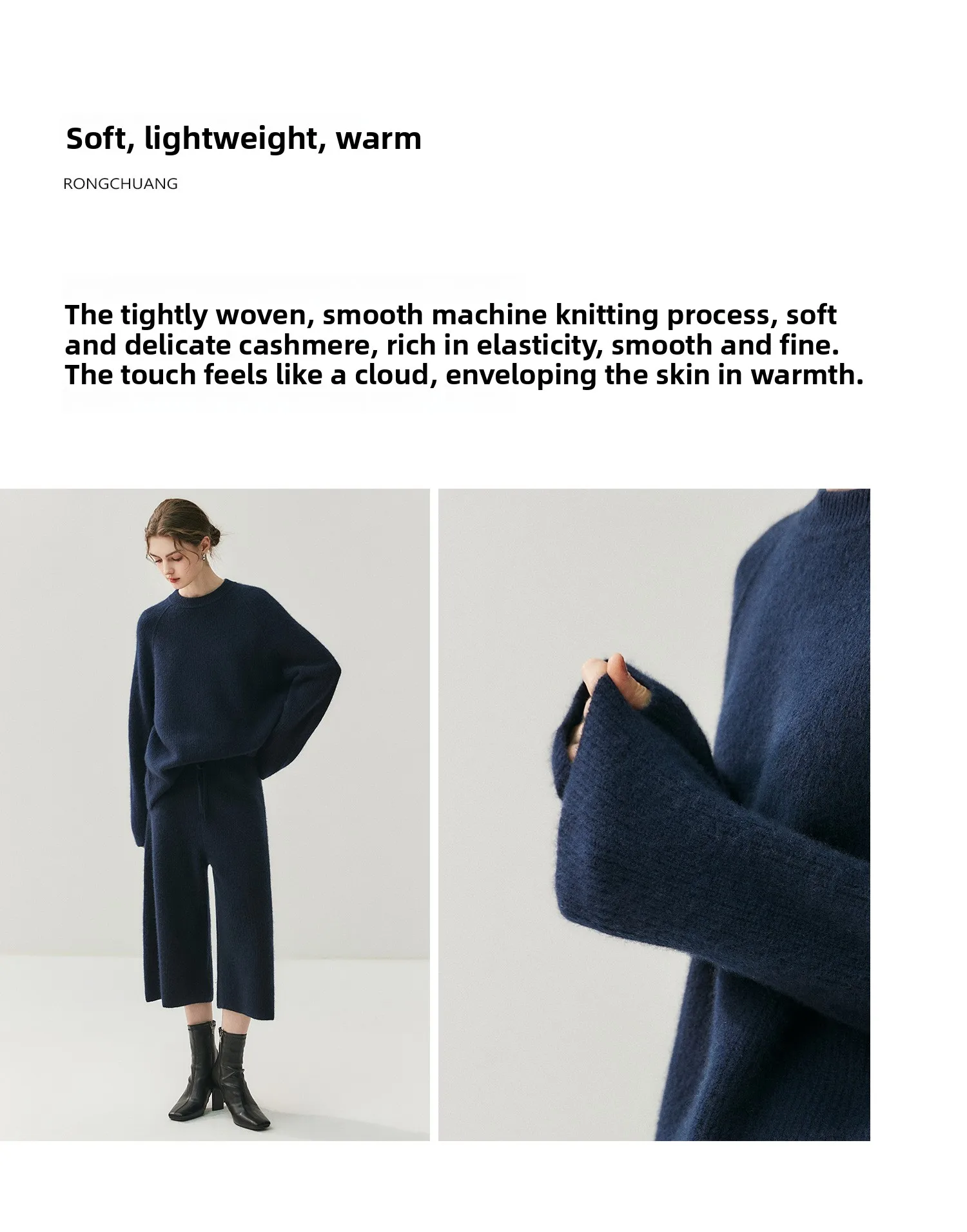 Cashmere is a 100% natural product extracted from Alashan League goats. The function of cashmere makes it one of the most popular materials in cold and humid environments. Even a thin layer of cashmere is more effective in keeping warm than any fiber. Crafted from high-quality cashmere, this set offers a luxurious feel and superior warmth for the cooler seasons.